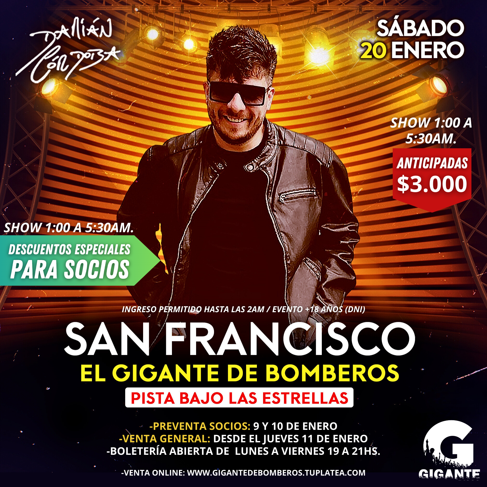 En cuanto a las anticipadas, los socios de bomberos podrán adquirirlas en preventa y con descuento el 9 y 10 de enero. Luego, desde el jueves 11 de enero comenzará la venta general. La boletería abrirá de lunes a viernes de 19 a 21hs. También, podrán conseguirse anticipadas online en la página del Gigante https://gigantedebomberos.tuplatea.com/producto/damian-cordoba-20-01/