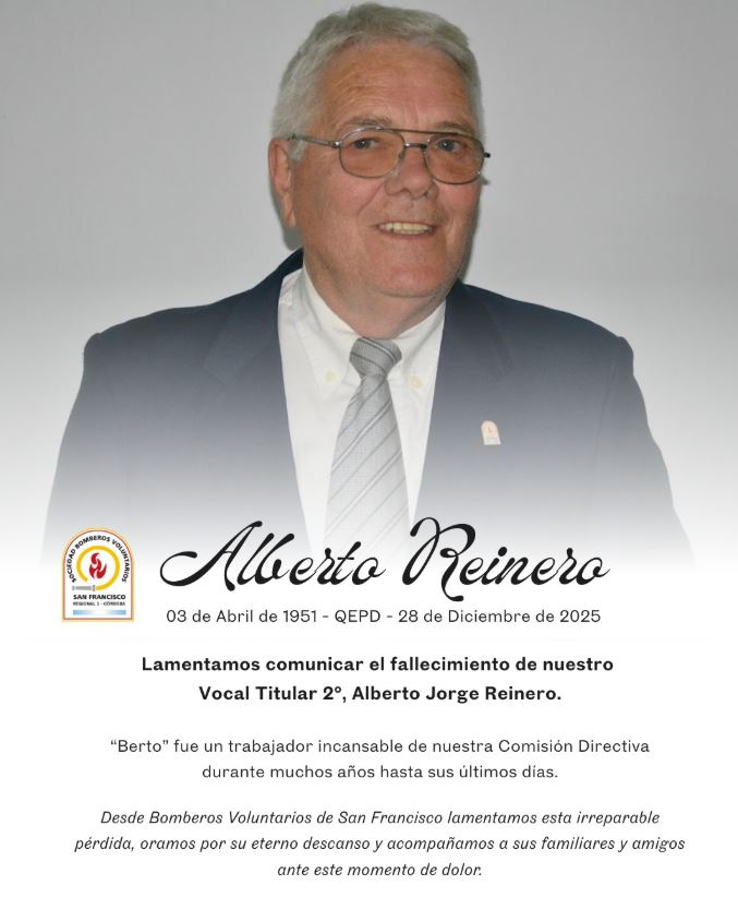 Con profundo pesar lamentamos comunicar el fallecimiento del Sr. Alberto Jorge Reinero, cariñosamente conocido como “Berto”, quien fuera integrante de nuestra Comisión Directiva durante muchos años, dejando una huella imborrable en la vida institucional de los Bomberos Voluntarios de San Francisco.