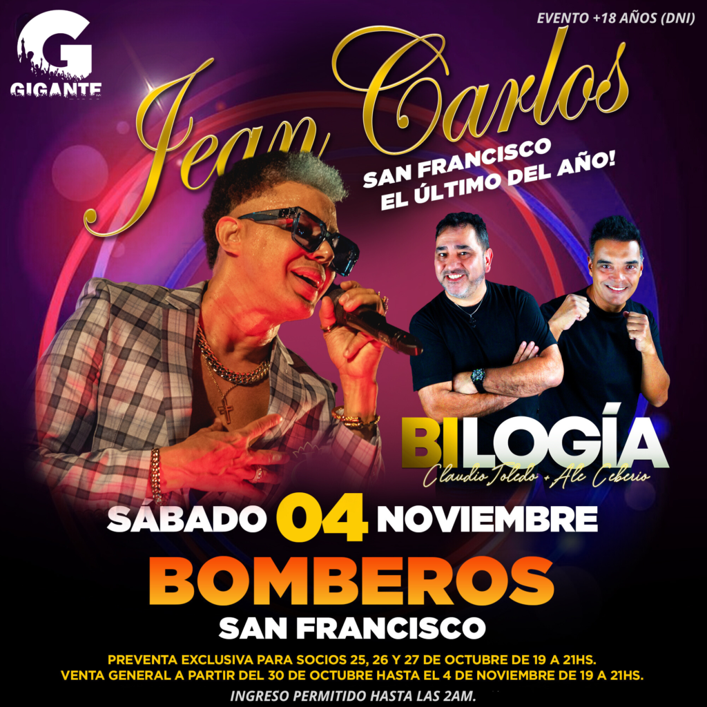 El sábado 4 de noviembre, las paredes del Gigante de Bomberos vibrarán al ritmo de tres históricos artistas del cuarteto. Se trata de Jean Carlos, Claudio Toledo y Ale Ceberio. Una noche inolvidable, donde los tres cantantes repasarán todos los éxitos de sus legendarias carreras.